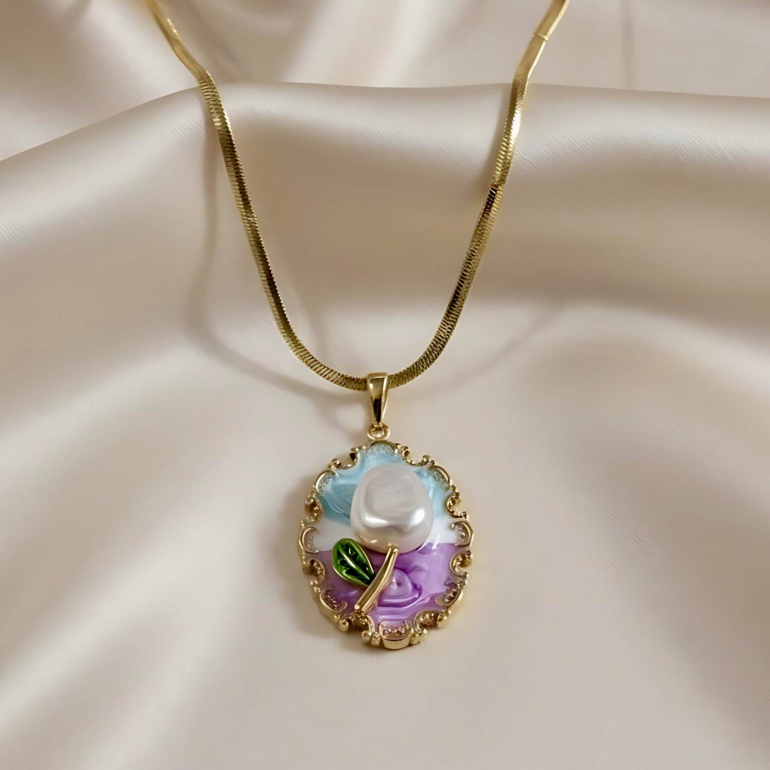 Step into a world of vintage charm with this exquisite Gold Plated Snake Chain Necklace. The centerpiece is a truly unique pendant, artfully crafted with a central Baroque Pearl that forms the petal of a subtle Enamel Tulip.