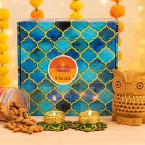 Festive Blue Gift Box – Designed with a colorful geometric pattern and “Happy Diwali” sticker, making it ready-to-gift without any extra wrapping.