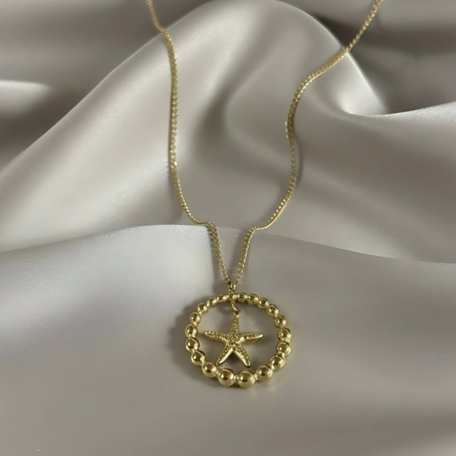 Make a sophisticated statement with this elegant Gold Beaded Circle and Starfish Pendant Necklace. This beautiful piece of Jewellery features a large, Chunky Ring composed entirely of highly polished Gold Beads, creating a wonderful texture and visual weight. Suspended perfectly within this outer ring is a small, detailed Starfish Charm, providing a delicate focal point.