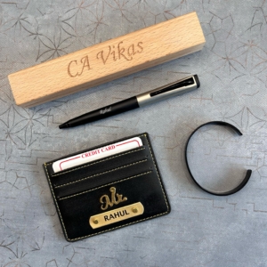 This Personalized Men’s Gift Combo is a stylish and thoughtful set that includes a custom name engraved pen, a black credit card holder with a nameplate and “Mr.” charm, a sleek black bracelet, and a premium wooden box engraved with a name. Designed for everyday utility and a touch of class, this combo perfectly blends function with personalization, making it a standout gift for any occasion.