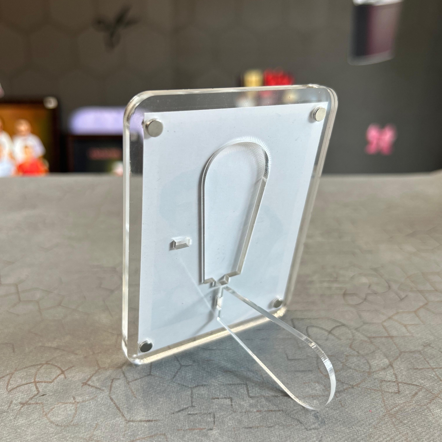 Crafted from premium quality acrylic, the frame has a sleek transparent finish that enhances the photograph inside. The magnetic corners ensure your picture stays securely in place while allowing you to swap photos easily whenever you like. With its lightweight and compact design, it can be displayed on any metallic surface like a fridge, almirah, or magnetic board, or placed on a desk/shelf as a stylish photo frame.