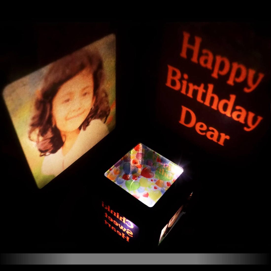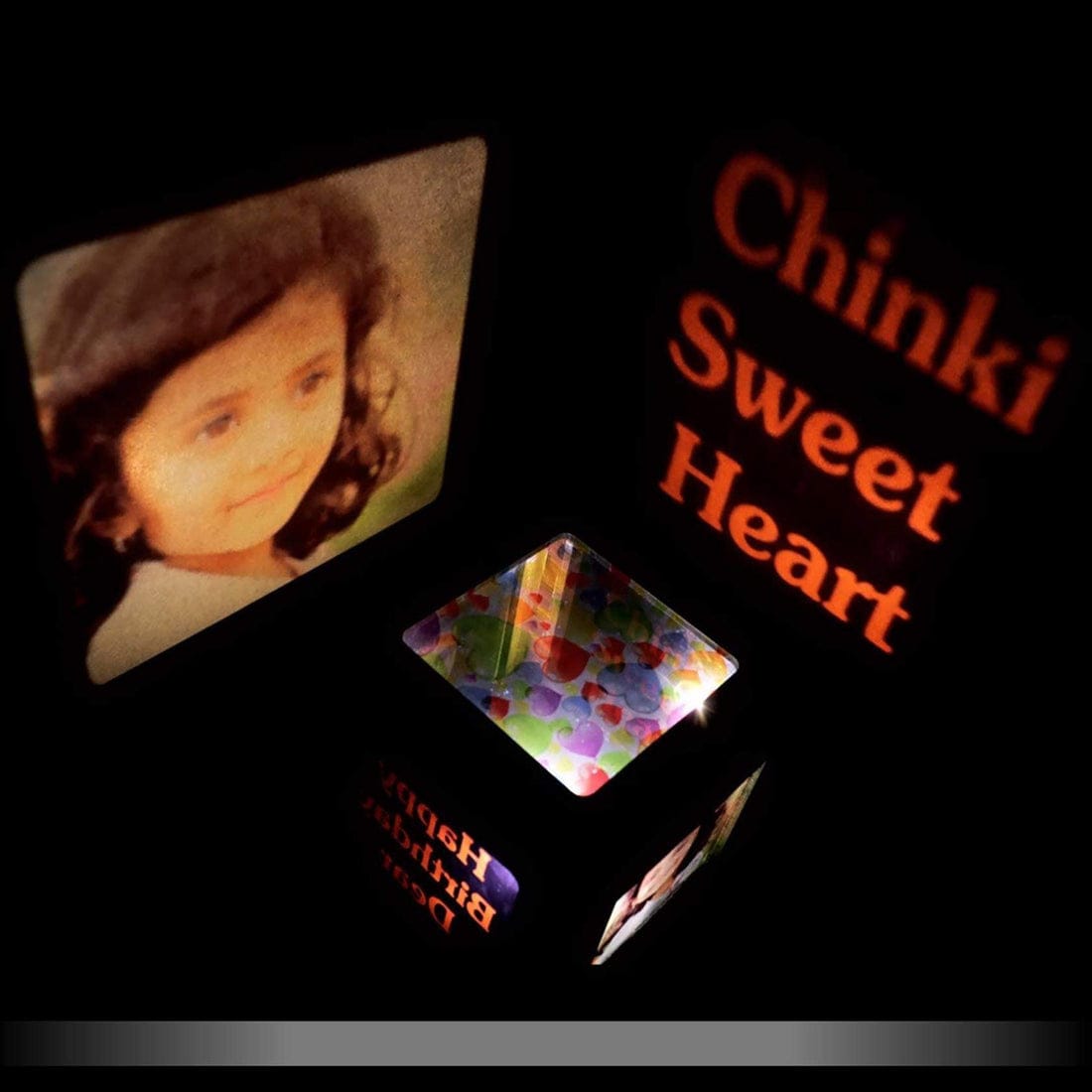 This is an exceptional personalized 3D photo cube LED light box birthday gift set that combines modern technology with timeless sentiment. The stunning black presentation displays “Happy Birthday Dear” messaging alongside personalized photo frames featuring a charming young girl’s portrait, complemented by a vibrant multi-colored 3D acrylic diamond-shaped photo cube and additional greeting card elements.
