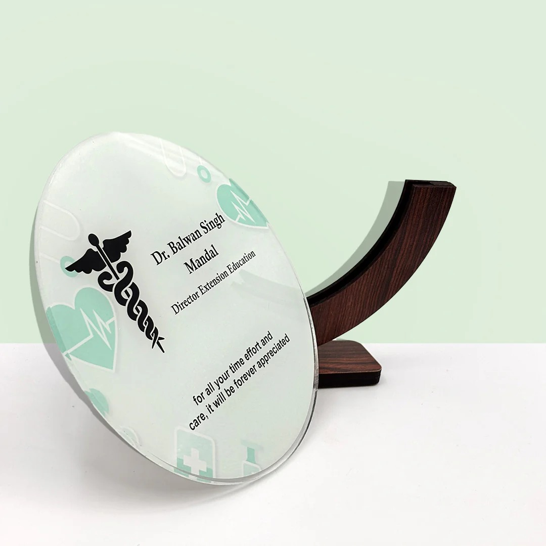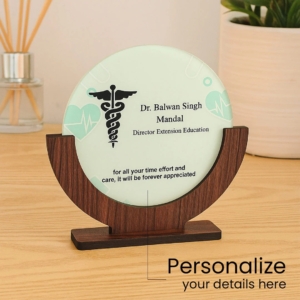 Honor the dedication and compassion of a healthcare professional with this elegant Personalized Doctor Appreciation Wooden Desk Nameplate. Designed with sophistication and gratitude in mind, this keepsake perfectly blends natural wood tones with a sleek round glass/acrylic front, making it a meaningful décor piece for any doctor’s office or study table.
