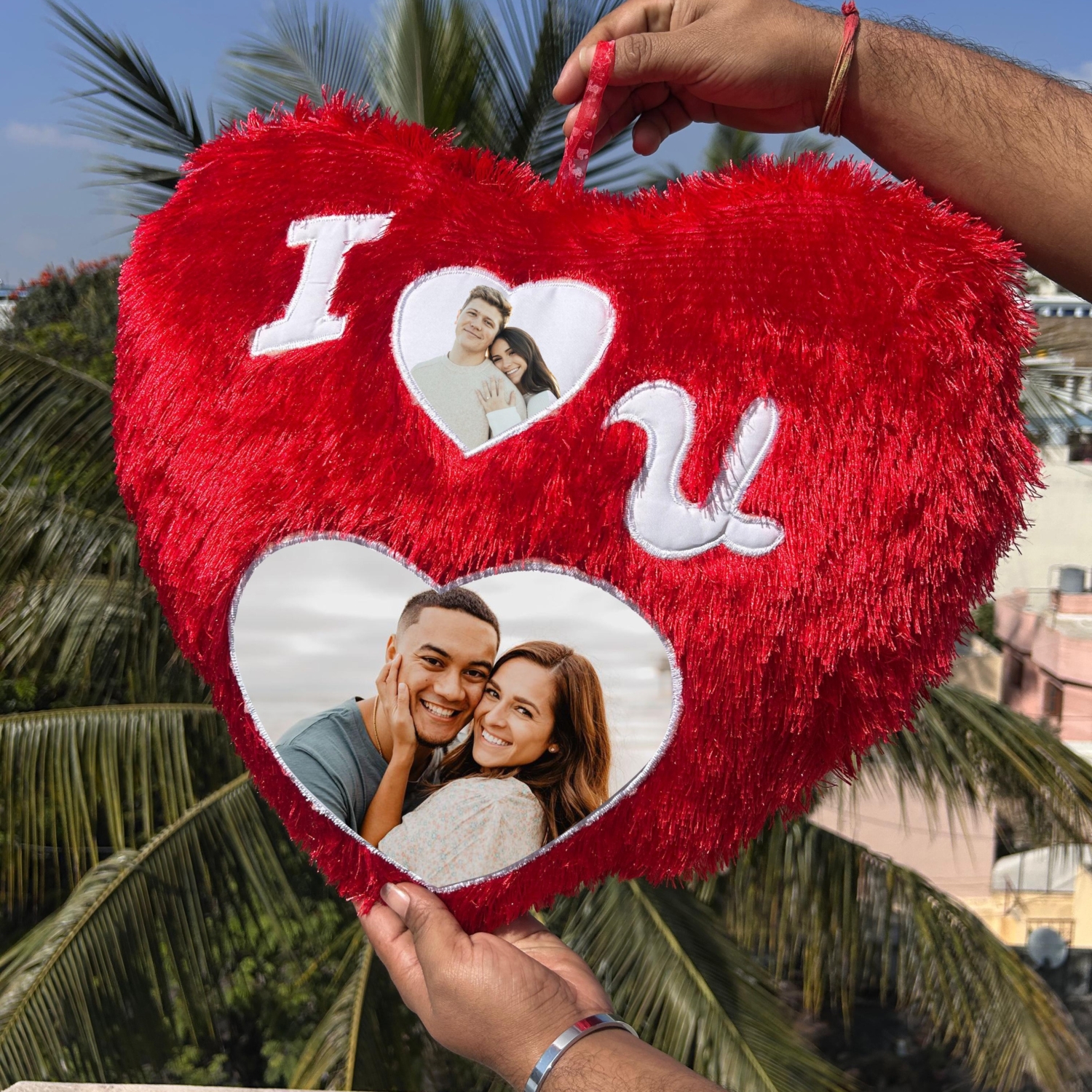 Surprise your loved one with this ultra-soft, luxurious Heart-Shaped Fur Pillow, designed to express love in the most personal way. Embroidered with the message “I ❤️ U” and featuring two heart-shaped photo slots, this plush cushion is the perfect romantic gift to showcase your favorite memories together.