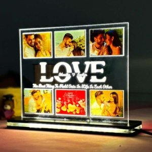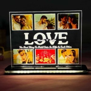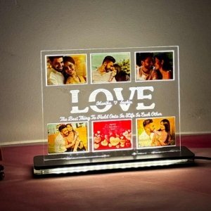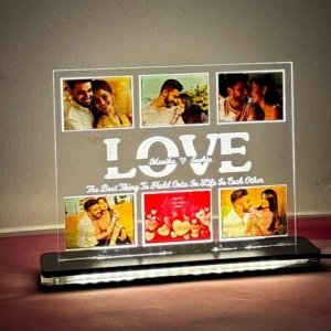 Multi-Photo Collage Layout : The design features a beautiful collage of six memorable couple pictures, arranged thoughtfully around the central LOVE engraving. Each photo spotlights your shared smiles, moments, and emotions turning the lamp into a miniature memory gallery.