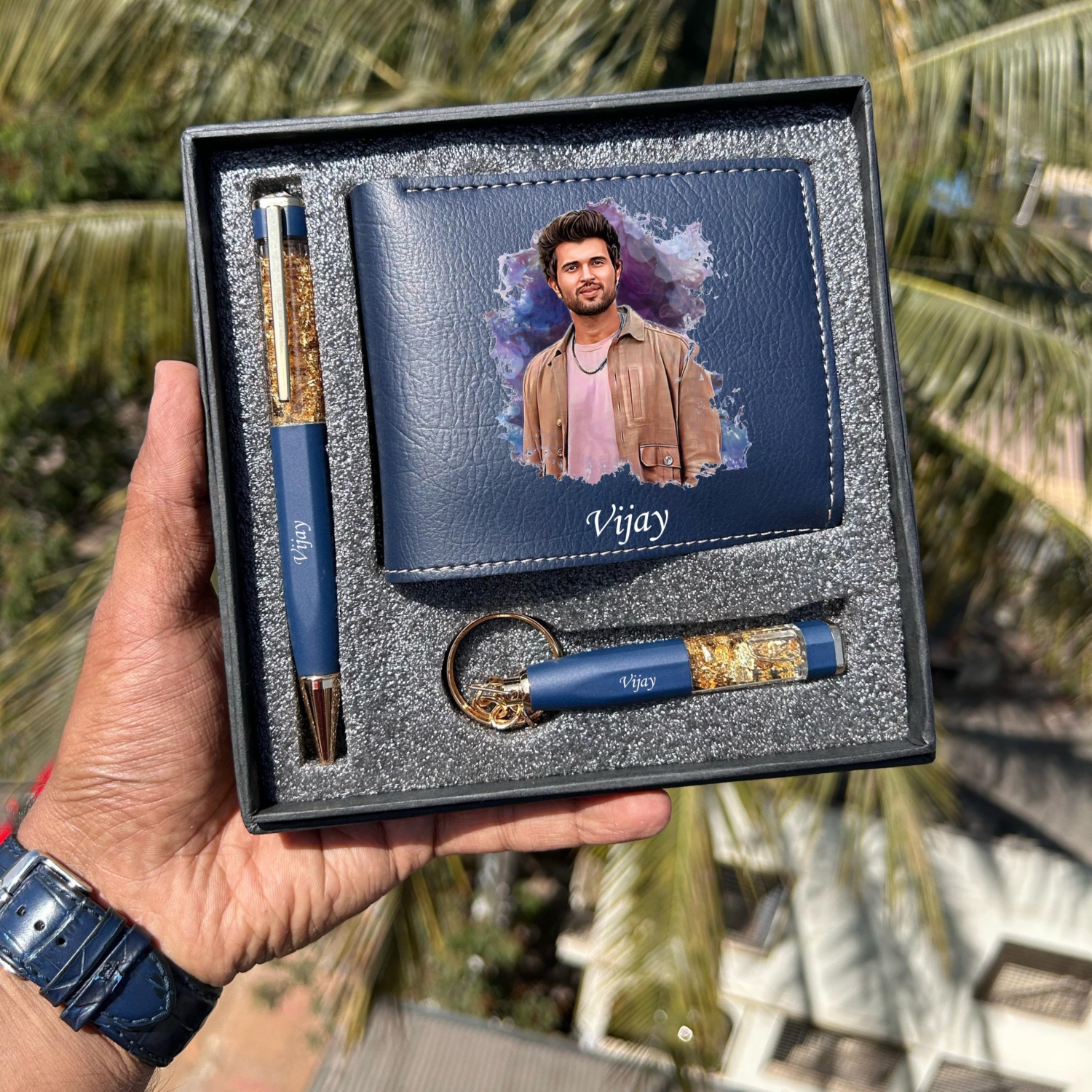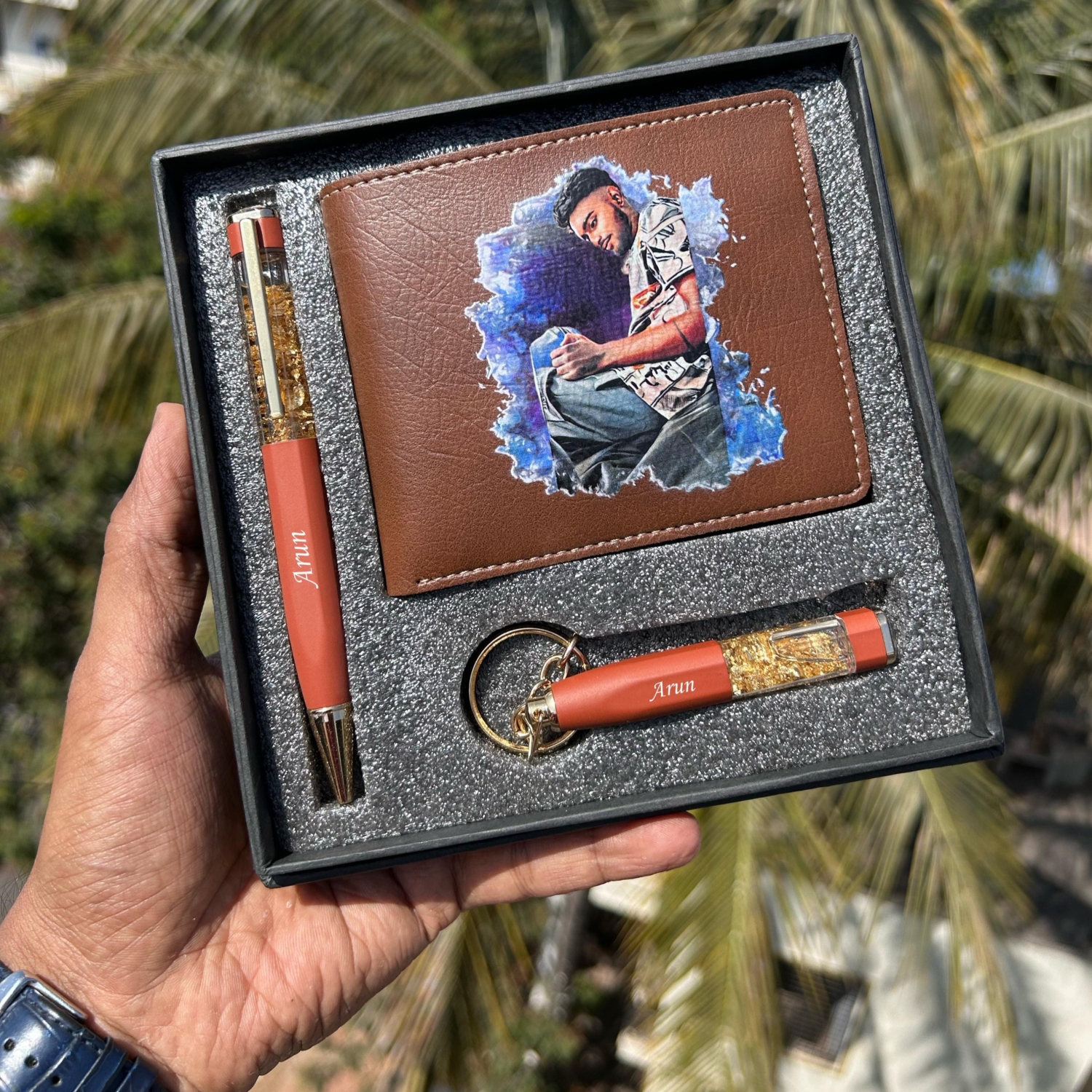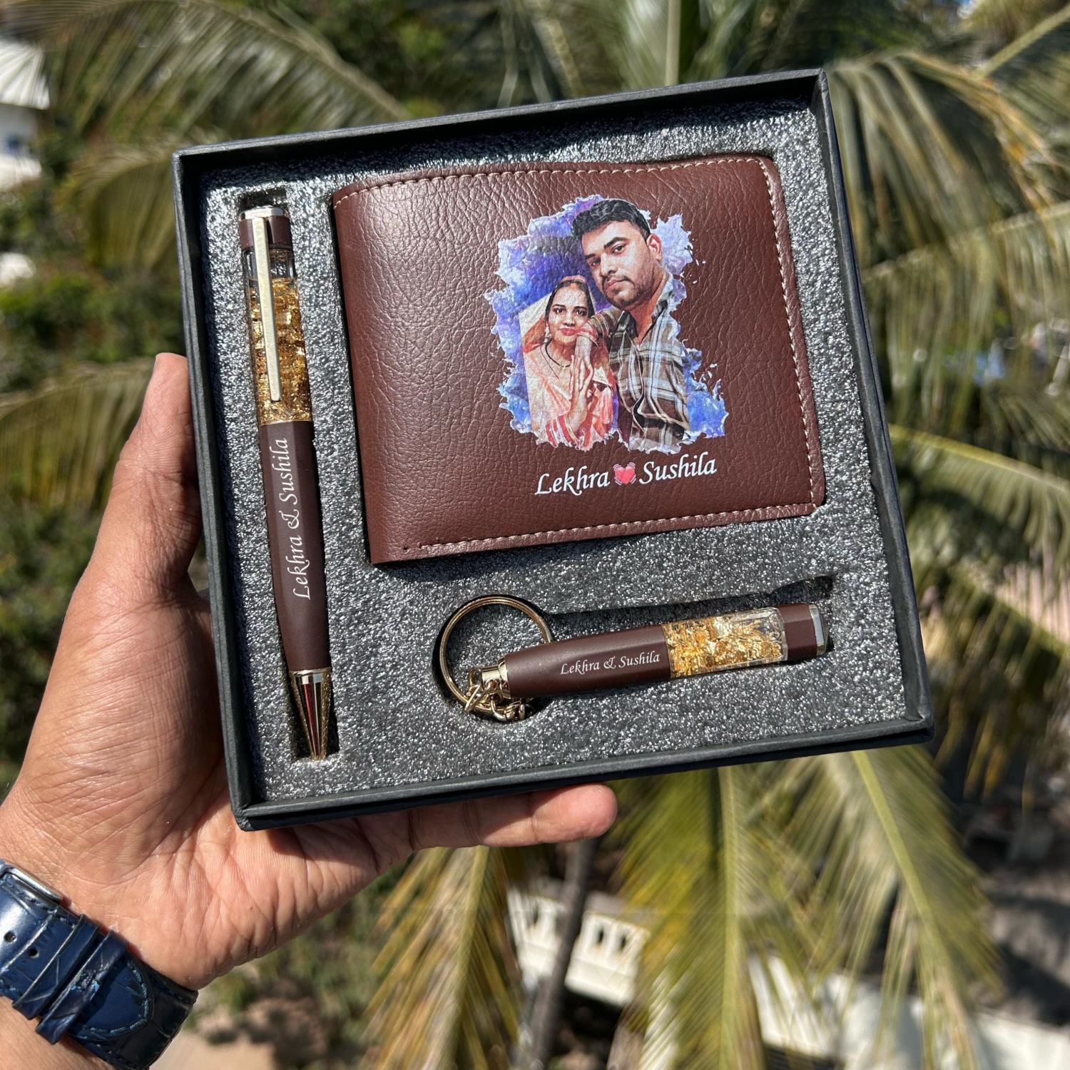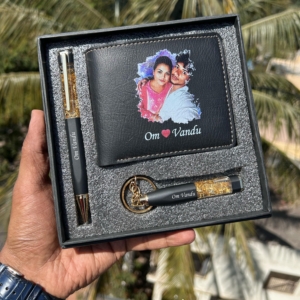 Make every occasion special with this premium customized gift set, thoughtfully designed for elegance and utility. This set includes a personalized wallet, pen, and keychain, making it a perfect choice for birthdays, anniversaries, corporate gifting, or a special surprise for your loved ones.