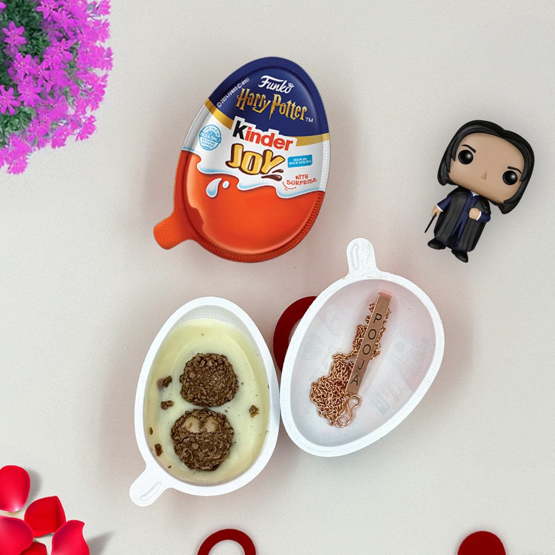 Turn a simple gift into a magical surprise with this Personalized Name Bar Pendant Necklace, beautifully presented inside a Kinder Joy pack. This unique gifting idea combines the excitement of unwrapping a Kinder Joy with the sentiment of receiving a customized keepsake.