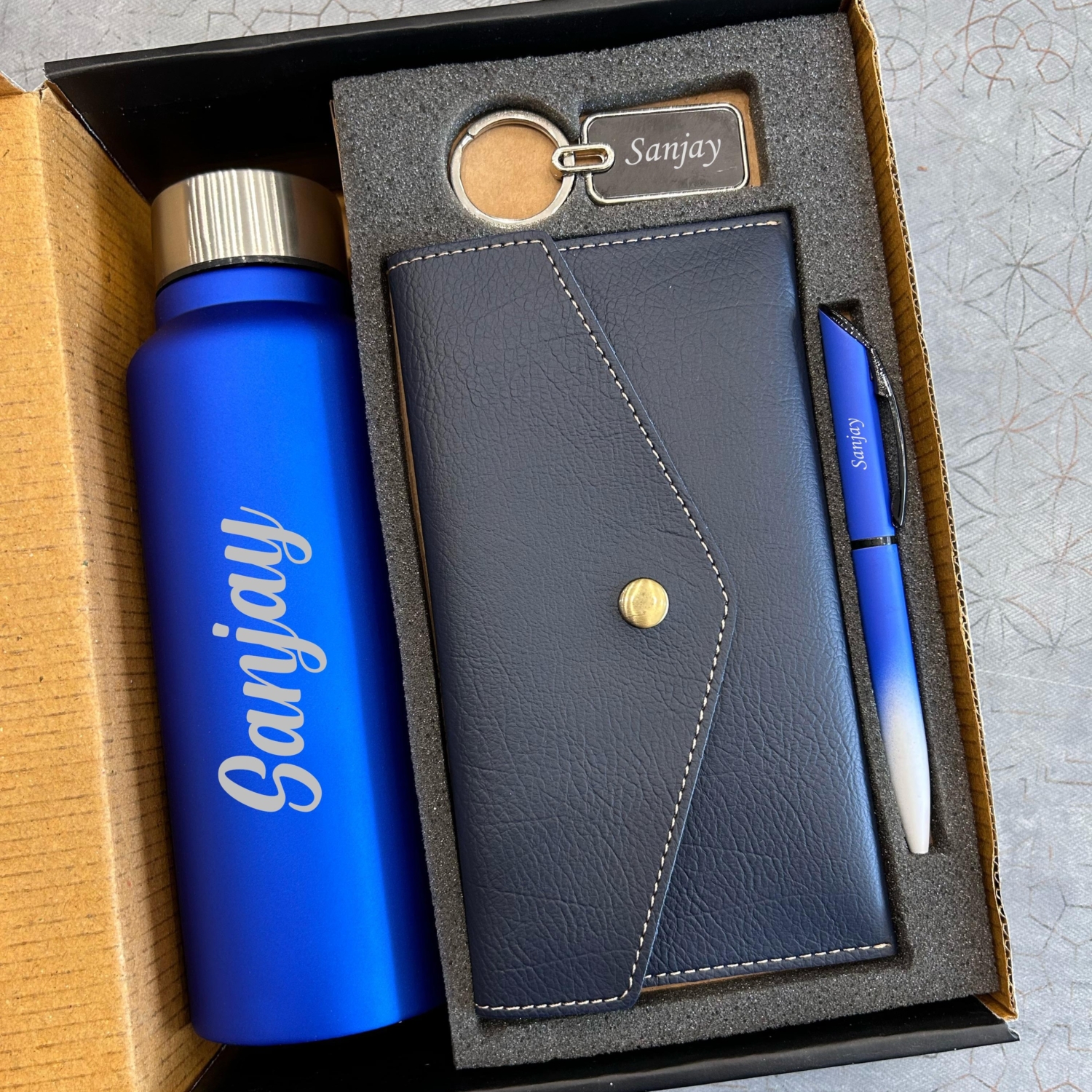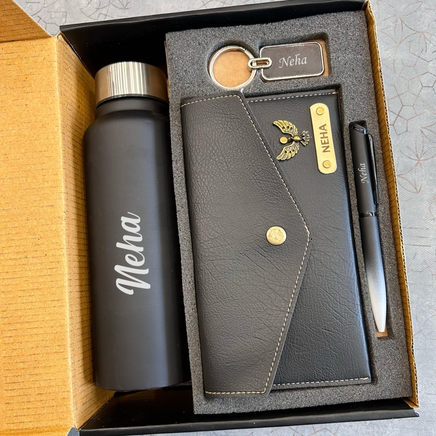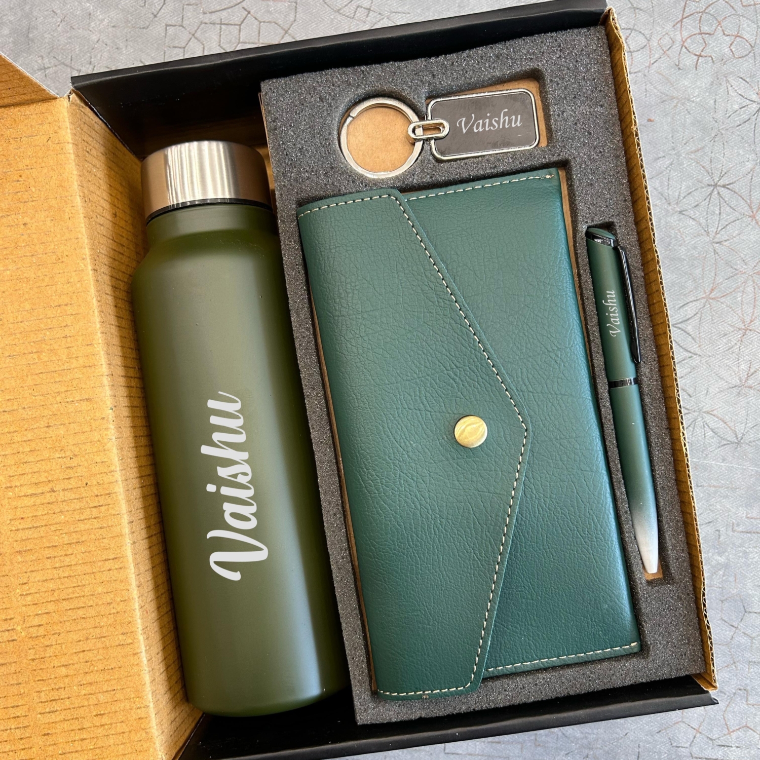 This is an elegantly curated personalized 4-in-1 premium gift set designed for the discerning professional who values both style and functionality. Featuring the name, personalized across each item, this luxurious combo includes a sophisticated stainless steel water bottle, a premium vegan leather wallet, a refined pen, and a metal keychain, all thoughtfully presented in an attractive gift box. This versatile set makes an exceptional gift for corporate recognition, special occasions, personal milestones, or self-indulgence.