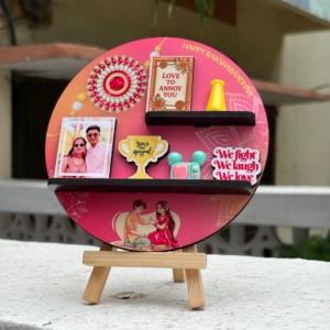 Make this Raksha Bandhan extra special with this beautifully curated Personalized Rakhi Table Miniature a heartfelt com bination of love, memories, and sweet surprises crafted especially for your sibling bond. Thoughtfully designed with vibrant colors and festive flair, this gift set is perfect for celebrating the timeless connection between brothers and sisters.