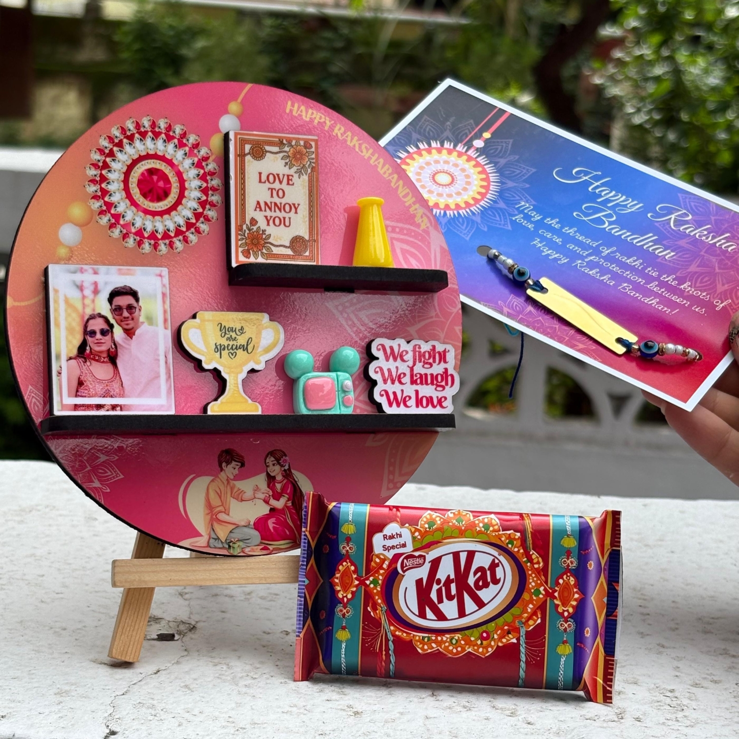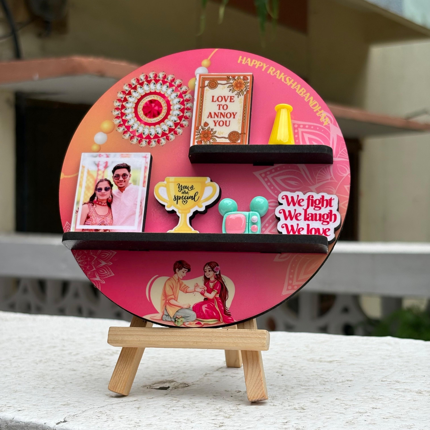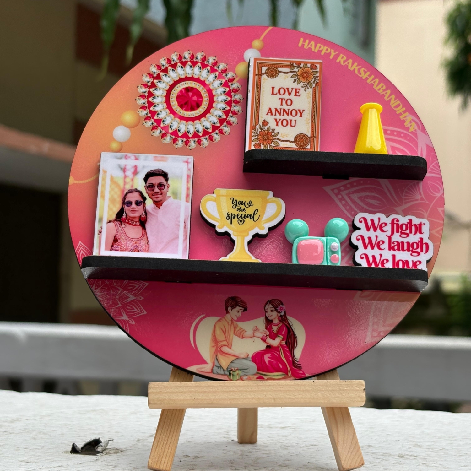 •Adorned with a traditional Rakhi motif and a miniature “Love to Annoy You” plaque — just like your sibling bond!
