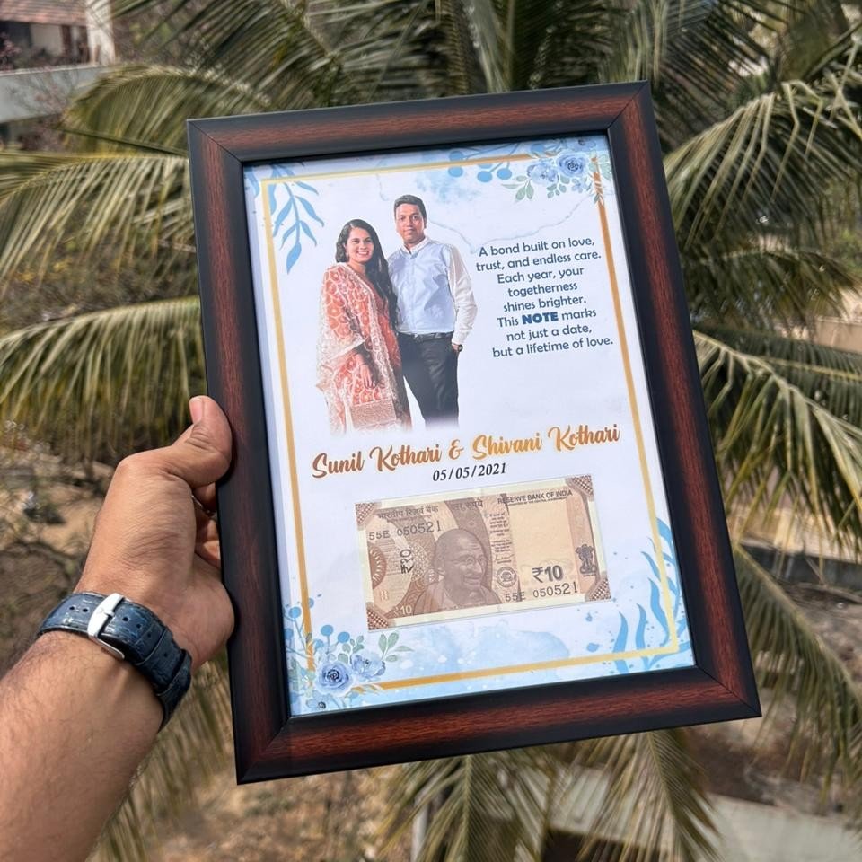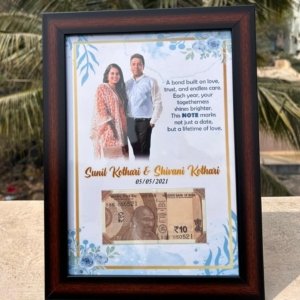 The frame showcases a high-quality printed layout featuring the couple’s picture, a heartfelt message, and the names along with their special date. Below it, a carefully selected ₹10 note bearing the same date number adds a unique and sentimental touch, making the frame a one-of-a-kind gift.