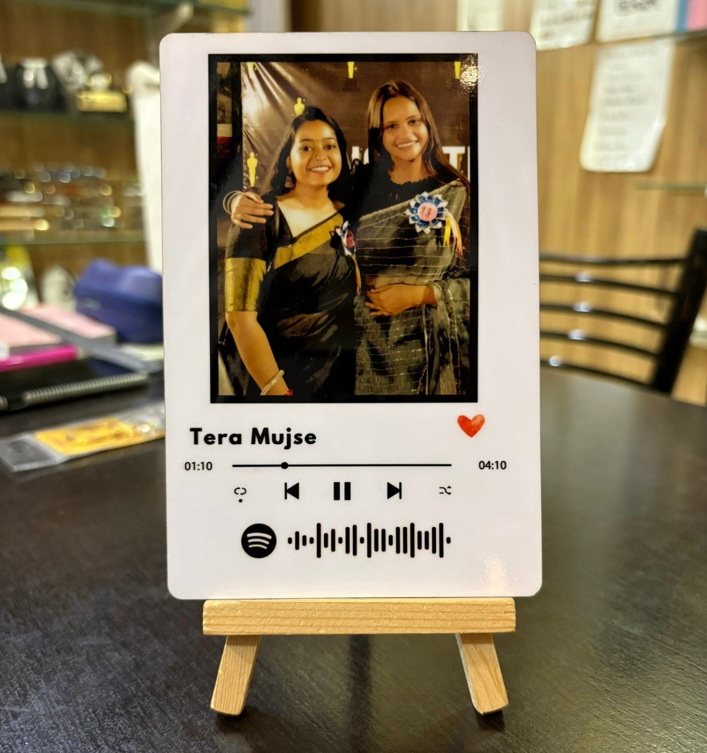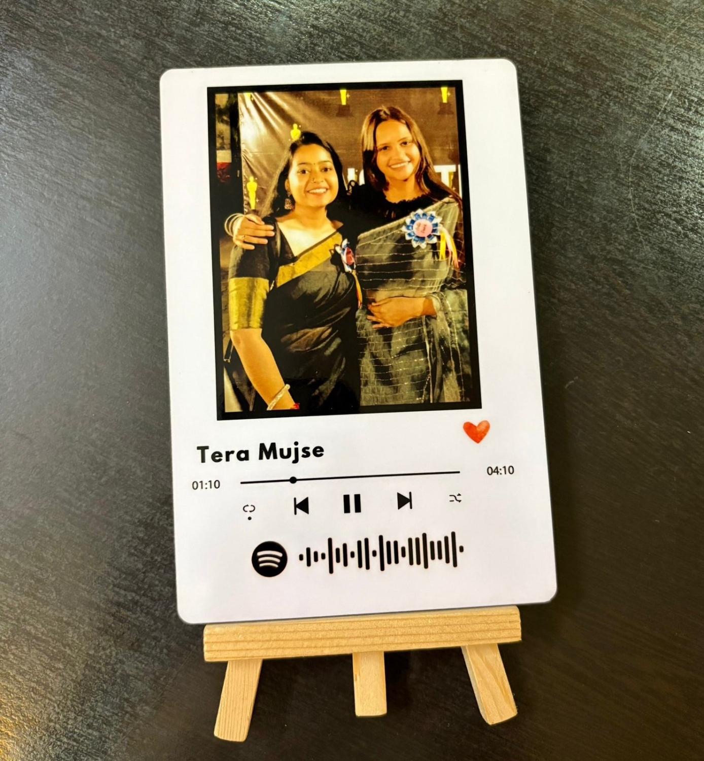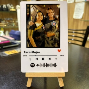 Celebrate memories with music through this custom Spotify themed photo frame,a perfect blend of emotion and style. This elegant tabletop display features a high quality printed photograph of your choice, paired with your favorite song title and Spotify code for instant playback. The display mimics a real Spotify music player interface, including controls, song duration, and a heartfelt red heart icon.