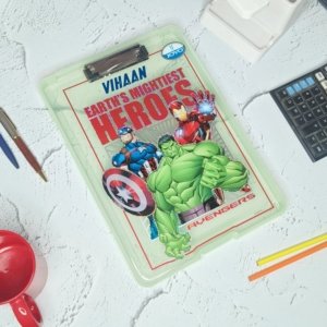 Bring fun, style, and practicality to your study or work routine with this Themed Clipboard. Designed with vibrant graphics , this clipboard is perfect for kids, students, or even adults. Crafted from durable, high-quality of Marvel’s iconic superhero plastic, this clipboard ensures a sturdy surface for writing, sketching, or organizing papers. The strong metal clip securely holds sheets in place, making it suitable for school, office, or home use. Personalized with the name on top, it adds a unique and special touch – ideal for gifting or personal use.