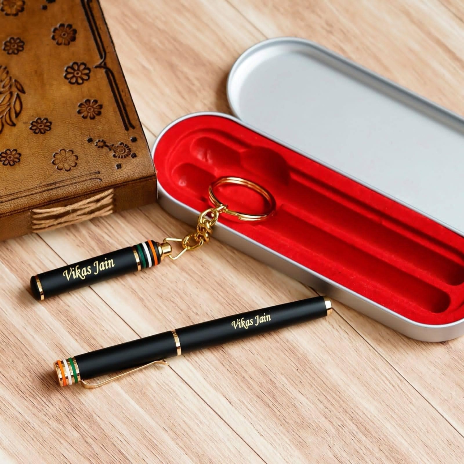 Personalized Tiranga Pen And Keychain Combo in box with engraved name on the top.