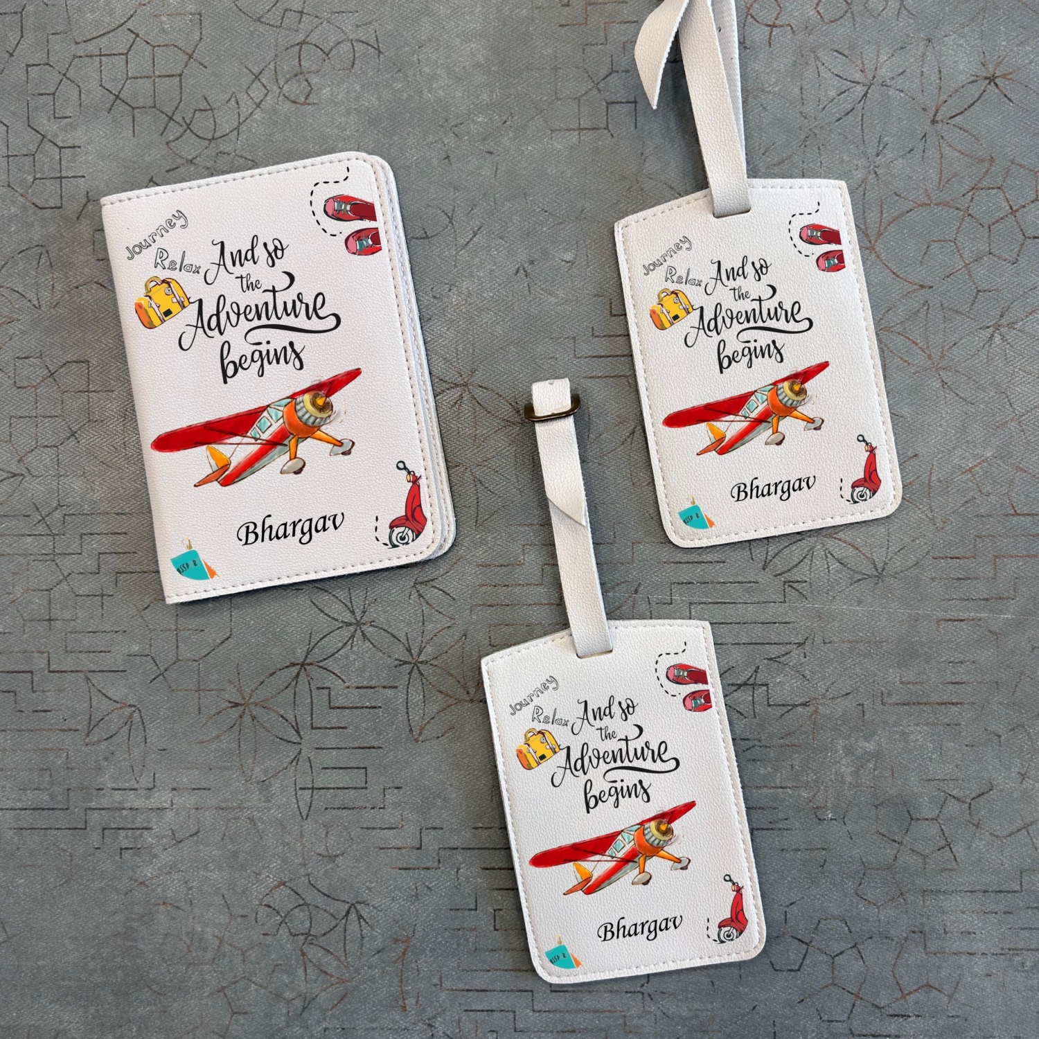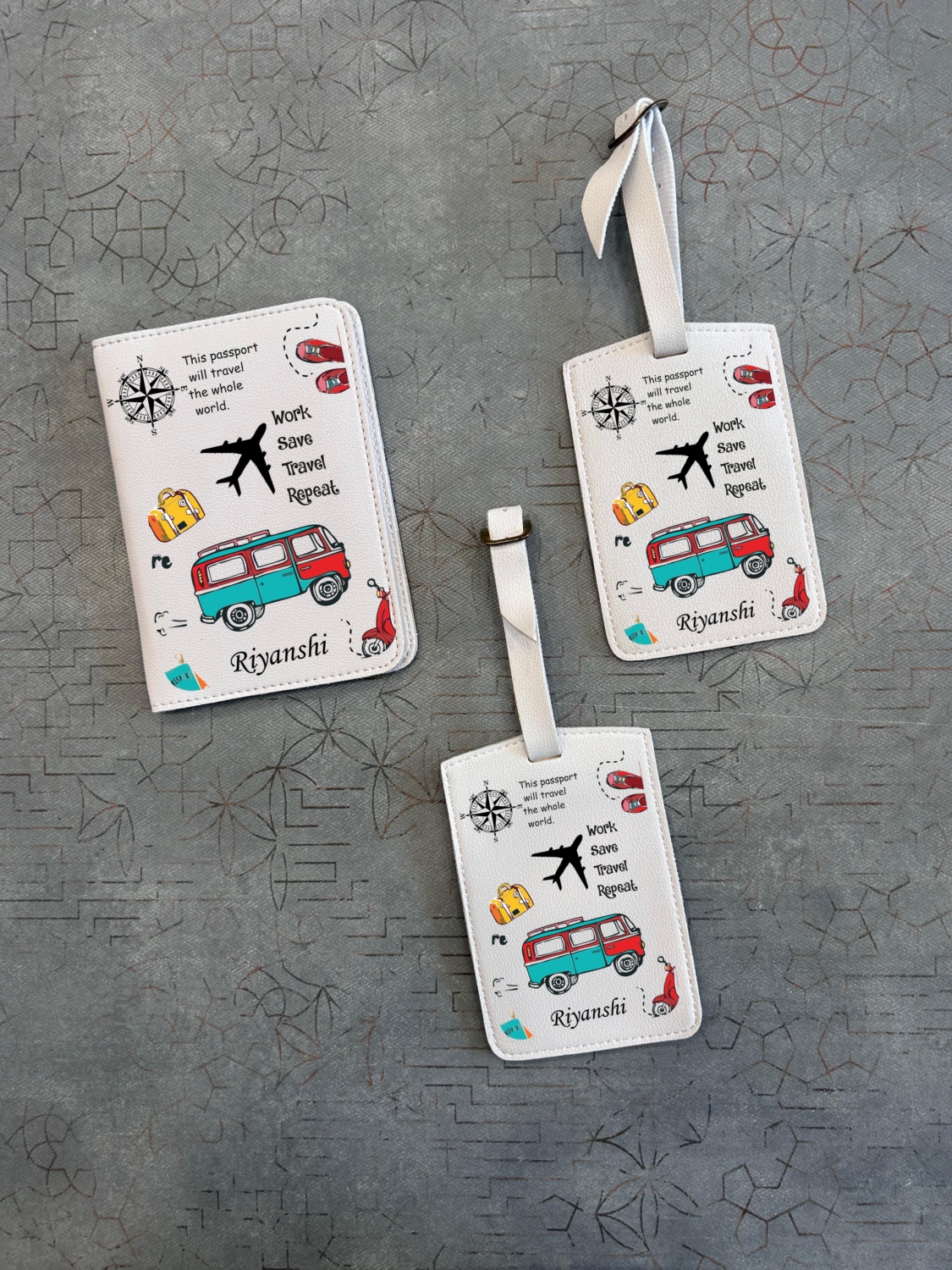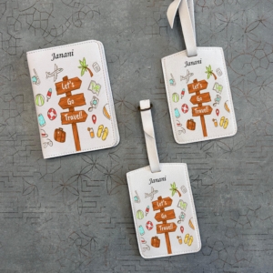 Personalized Touch: Each passport cover and luggage tag is customized with the name Janani, giving it a unique and personal identity.
