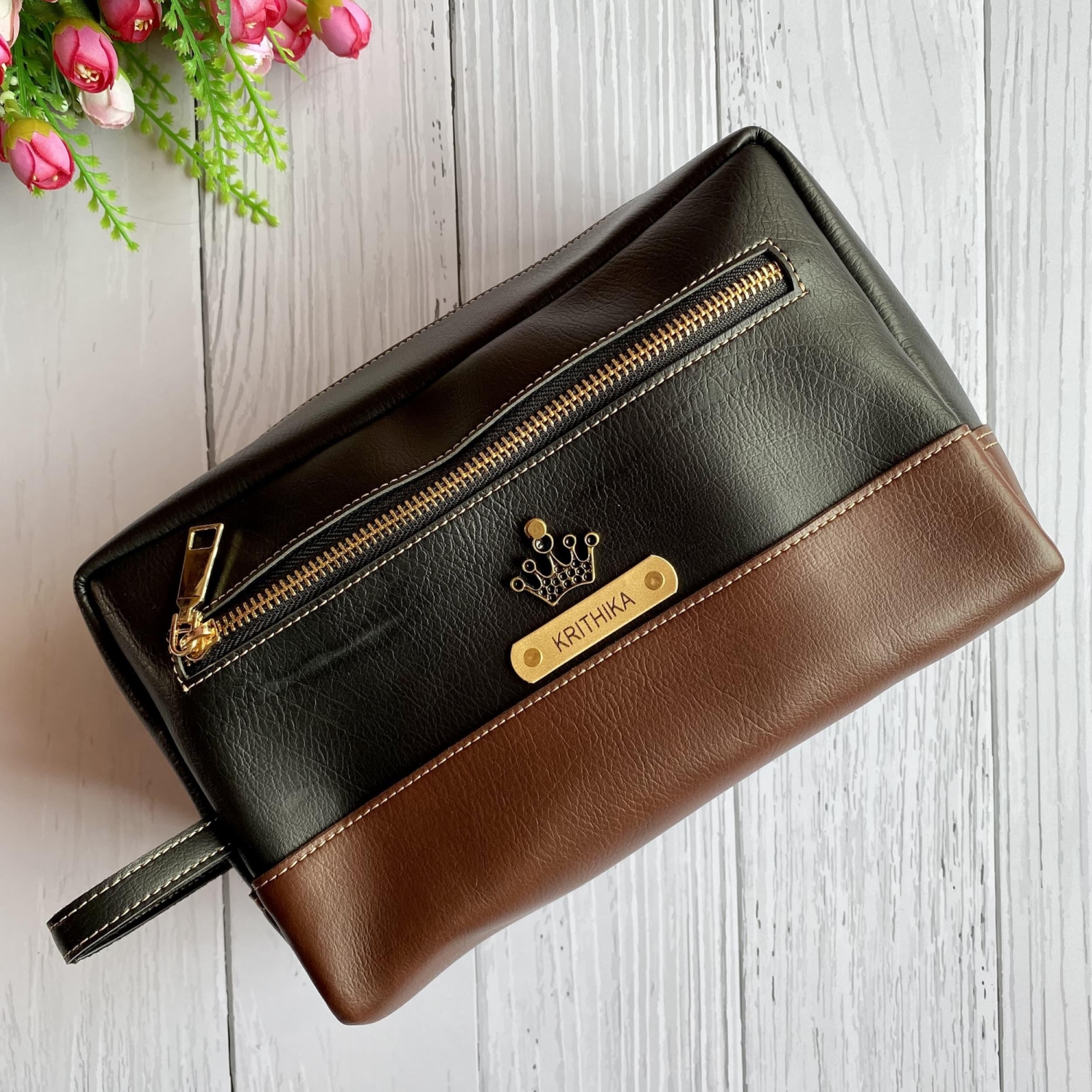 Add a sophisticated touch to everyday essentials with this Personalized Faux Leather Pouch, crafted in an elegant two-tone brown and black design. Custom-inscribed with the name on a sleek gold nameplate, this pouch is a perfect blend of style, functionality, and sentimentality.