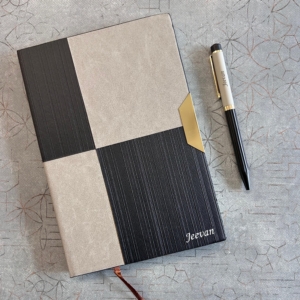 Notebook : Elegant two-tone cover design in black and grey with a subtle striped texture. Accented with a golden corner plate for a classy and professional look. Personalization with engraved name, it a one-of-a-kind keepsake. Smooth, durable leatherette finish ensures long-lasting use.