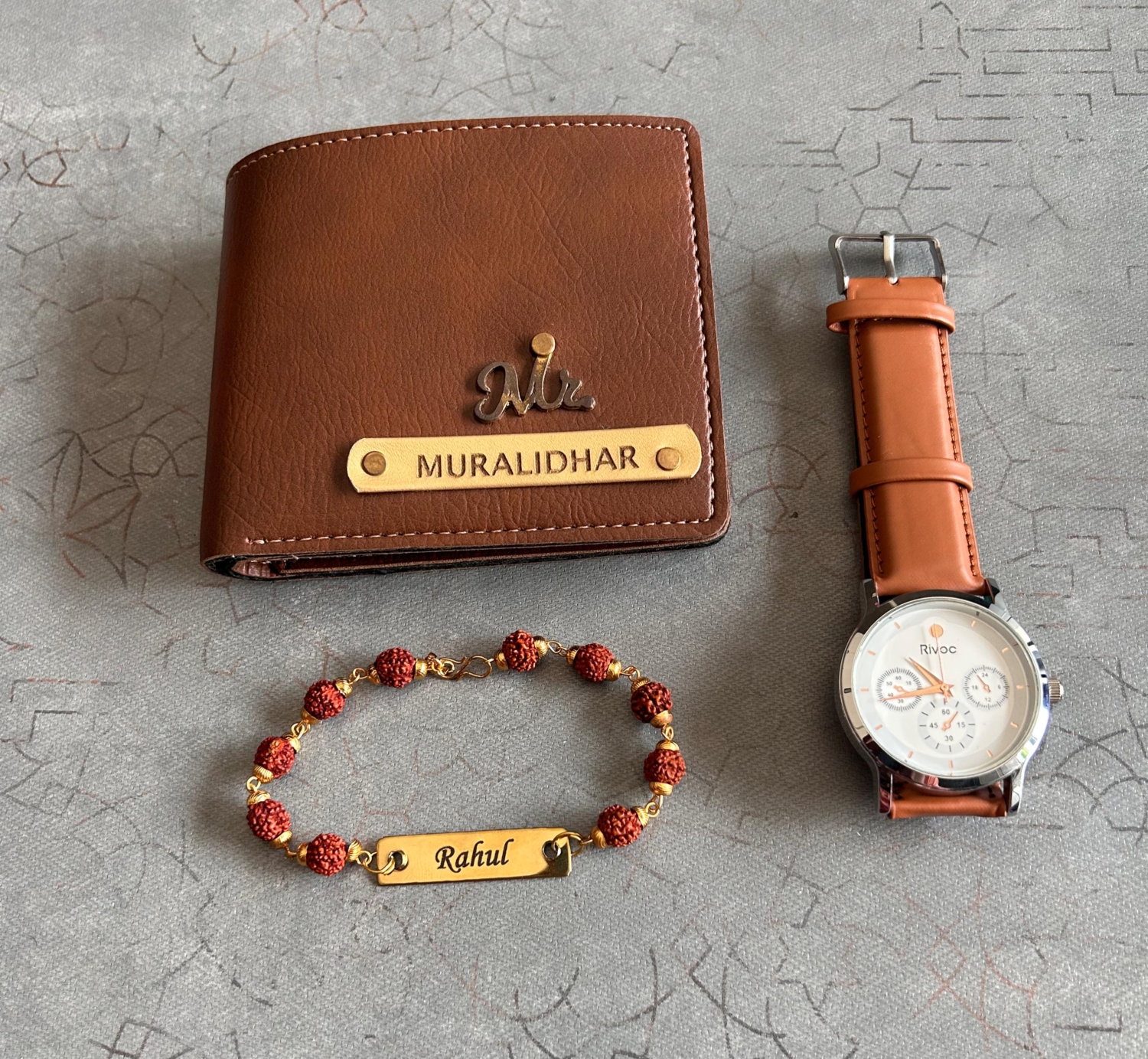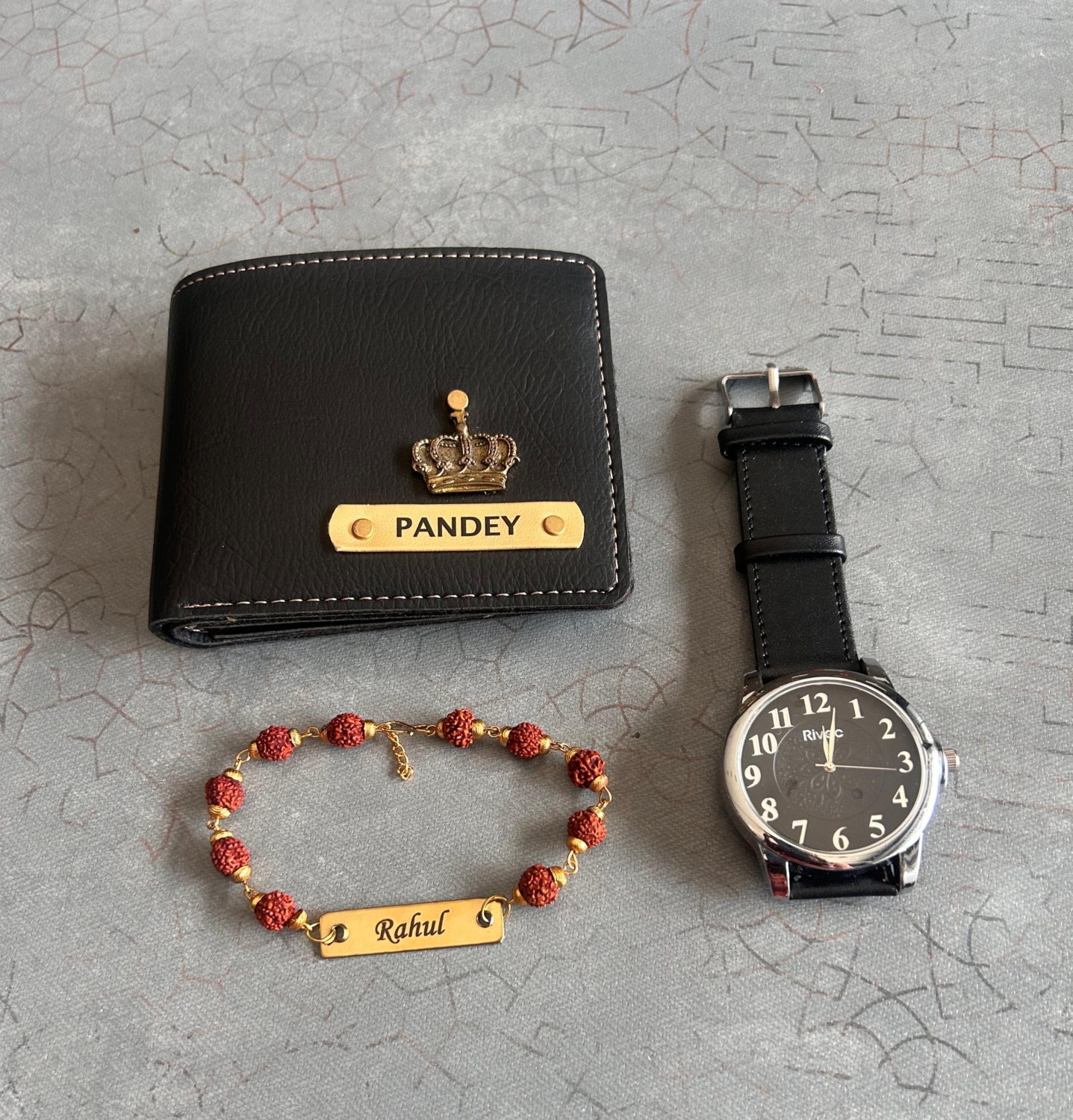 Celebrate the charm of timeless elegance and personal style with this Premium Personalized Men’s Gift Set, thoughtfully curated to leave a lasting impression. This stylish trio includes a sleek black leather wallet, a classic analog wristwatch, and a sacred Rudraksha beaded bracelet, all customizable to make your loved one feel truly special.