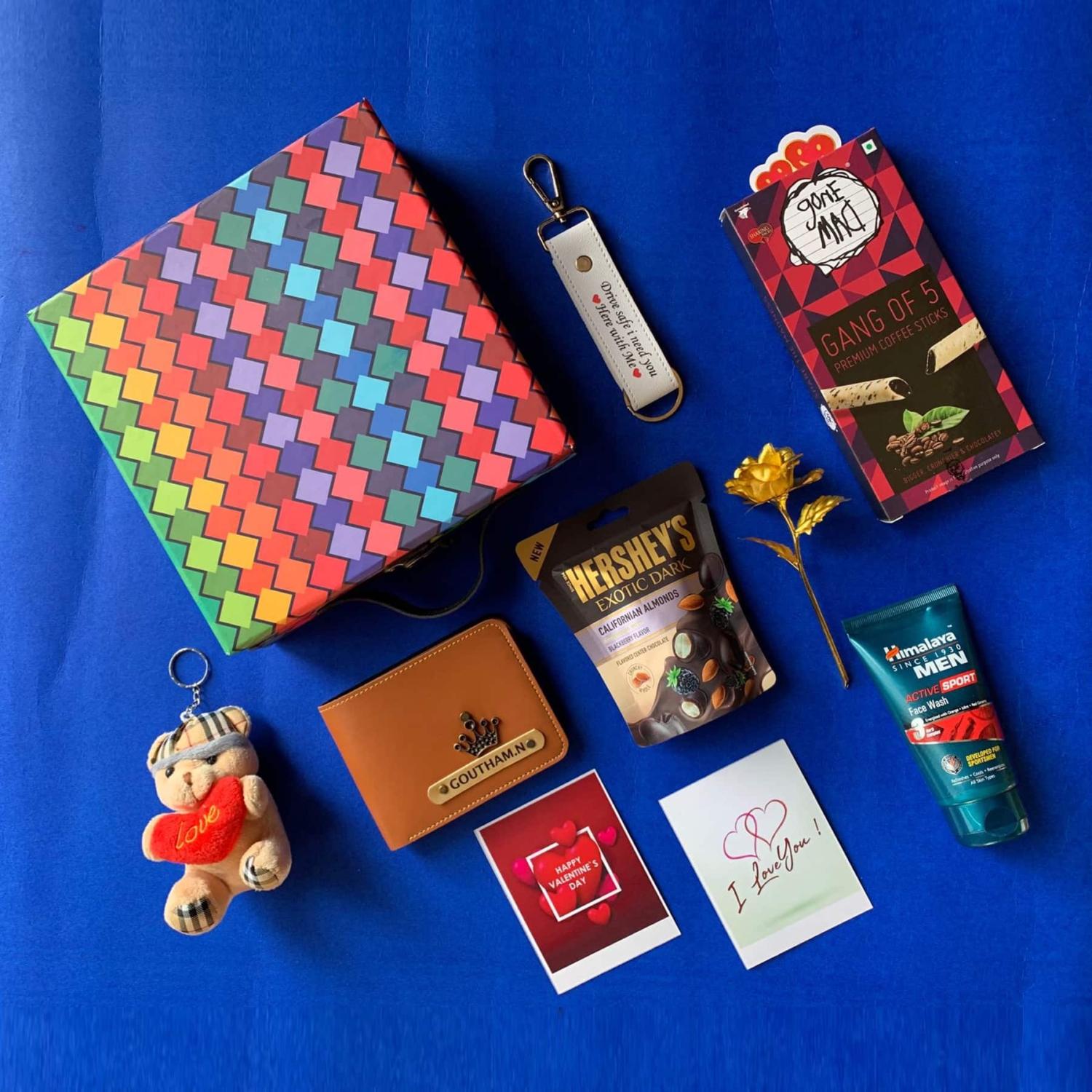 This Beautiful Combo Includes Fancy Rainbow Box, Customized Wallet,1 White Hook Keychain (Drive Safe), Golden Rose, Teddy Keychain, Hersheys, Himalaya Face Wash, 5 Gone Mad Sticks & 2 Valentine Cards.