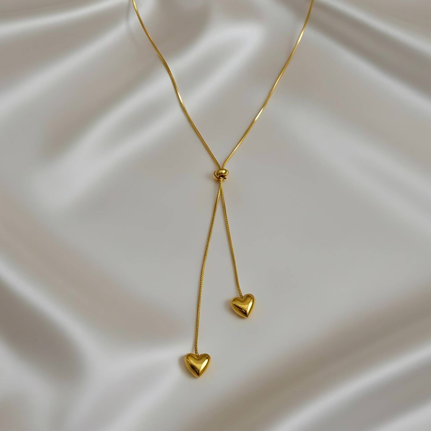Discover the chic simplicity of this Gold Heart Necklace. This piece features a continuous, Sleek Chain that loops through a subtle central knot, creating a perfectly draped Fixed Y-Shape drop. The elegant drop is finished with two charming, high-polish Puffy Heart Charms that catch the light beautifully as they move.
