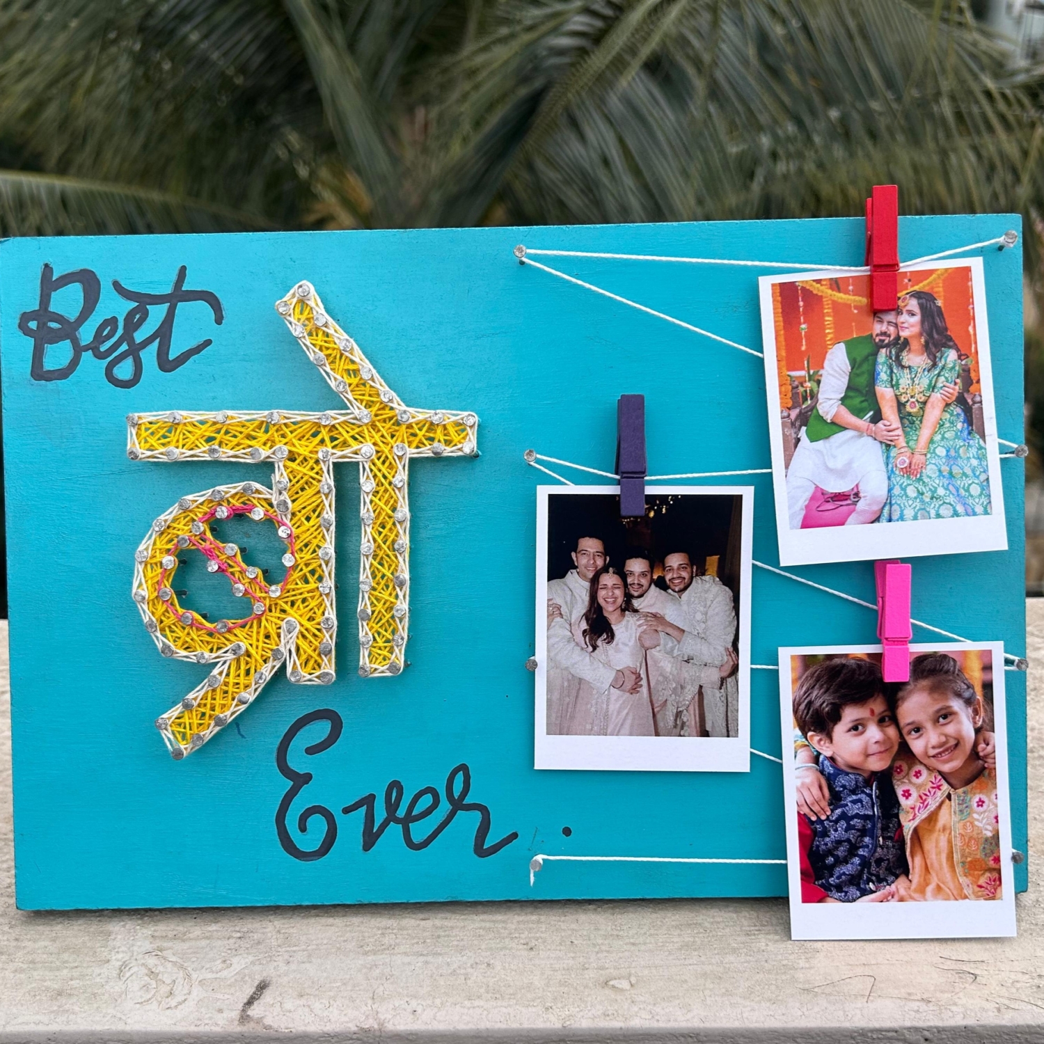 At the heart of the frame is the word “BRO” meticulously created using vibrant yellow and white string art, intricately woven over strategically placed nails to form the Hindi letters. Adding charm and personalization, the word “Best” is stylishly handwritten above and “Ever” below in a playful calligraphy style.