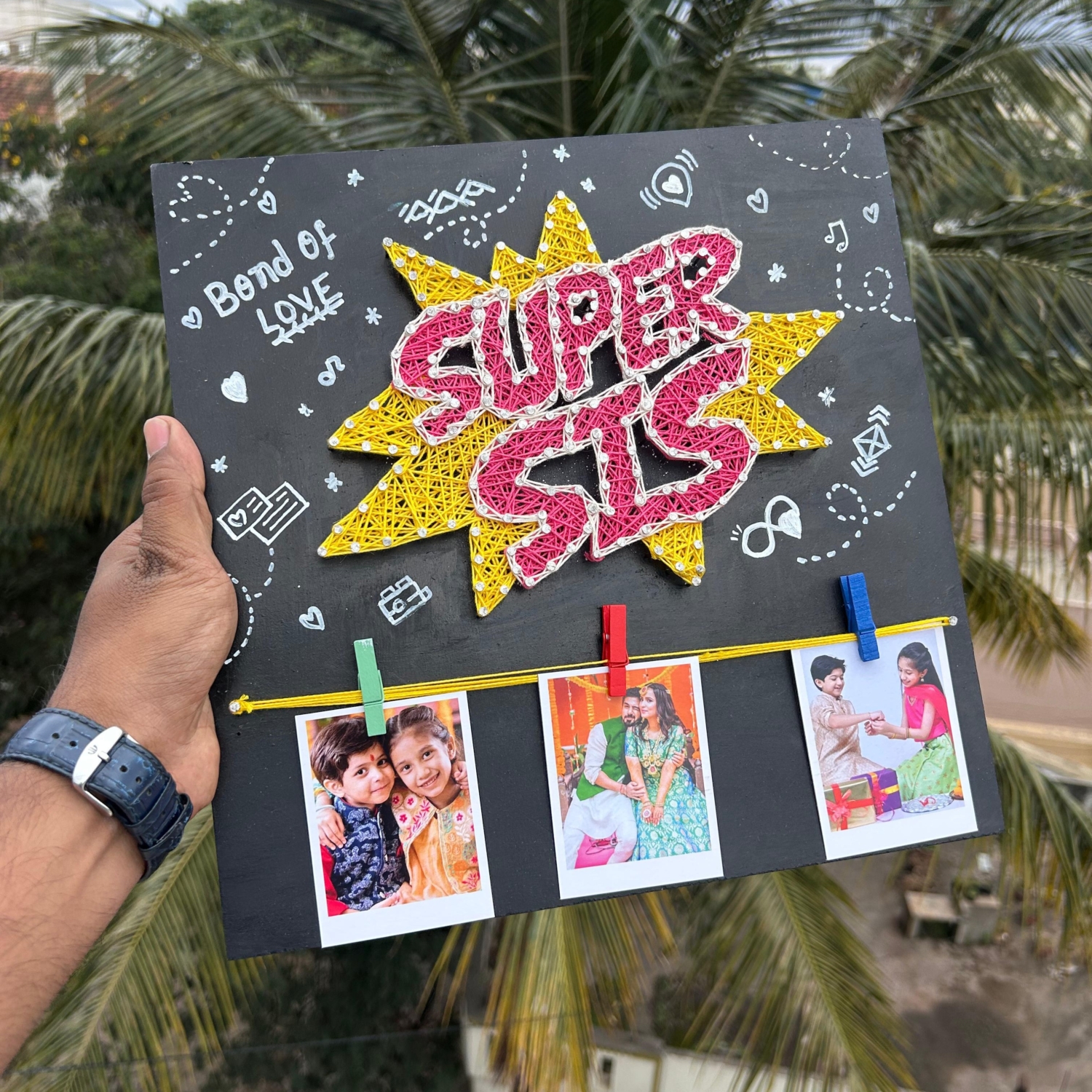 Celebrate the beautiful bond of siblinghood with this handcrafted “Super Sis” photo frame – a heartwarming tribute to your sister that’s perfect for Raksha Bandhan, birthdays, or just to show your love. This unique and vibrant wall décor piece combines creativity, sentiment, and personalization, making it a standout keepsake.