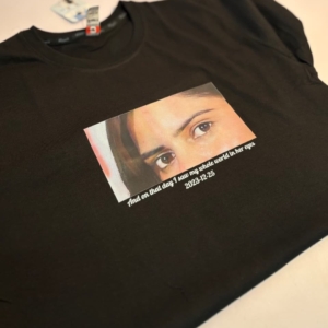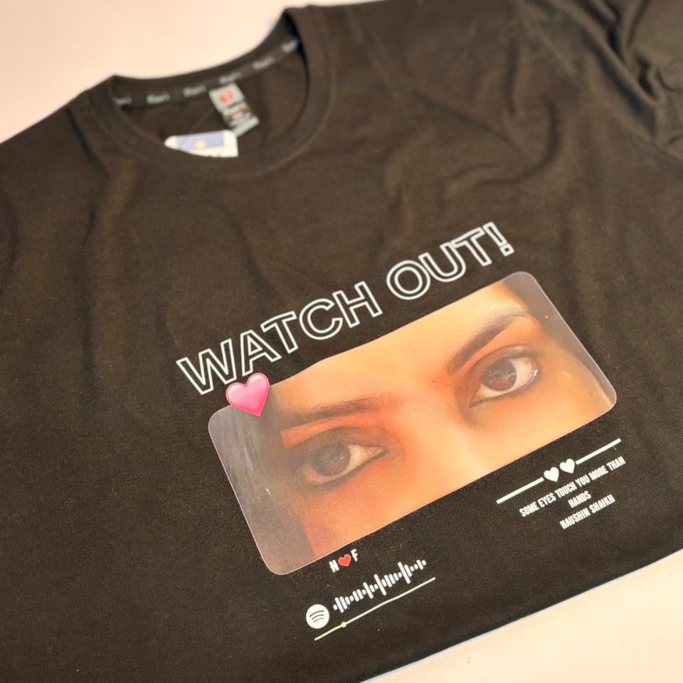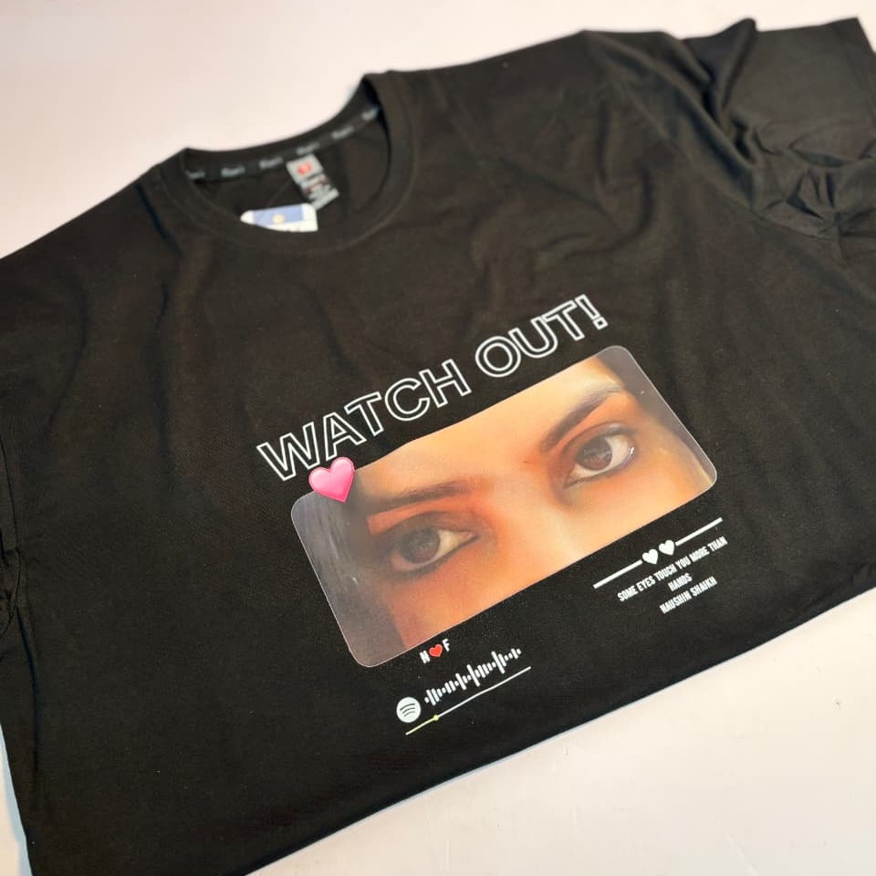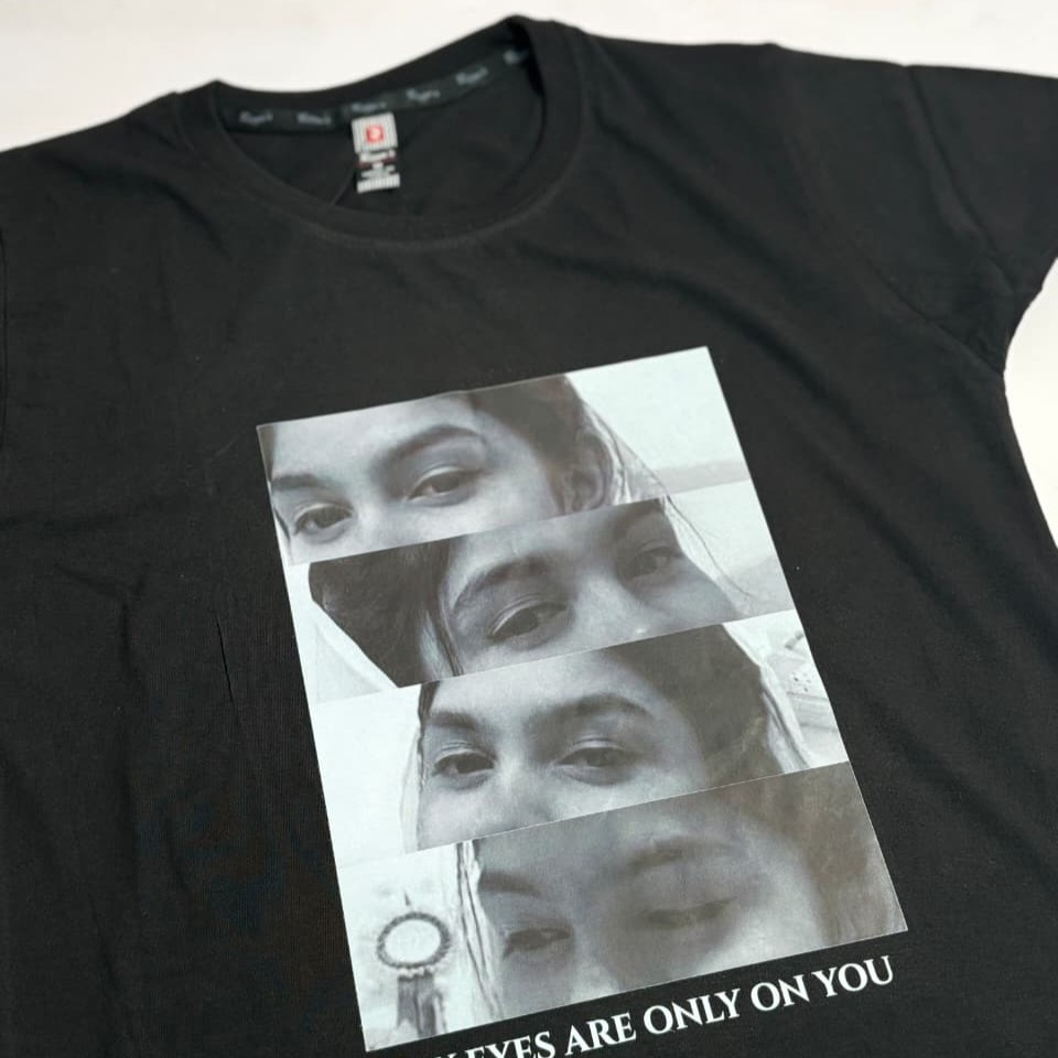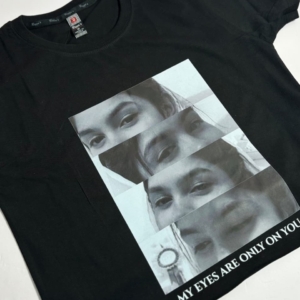 The highlight of this T-shirt is the eye-catching graphic design on the front. Featuring a collage of expressive eyes with vibrant effects, heart icons, and floral details, it adds a bold and artistic touch to your outfit. Below the design, the heartfelt quote “My eyes only looking for you” is printed, making this tee perfect for those who like clothing with a personal and emotional vibe.