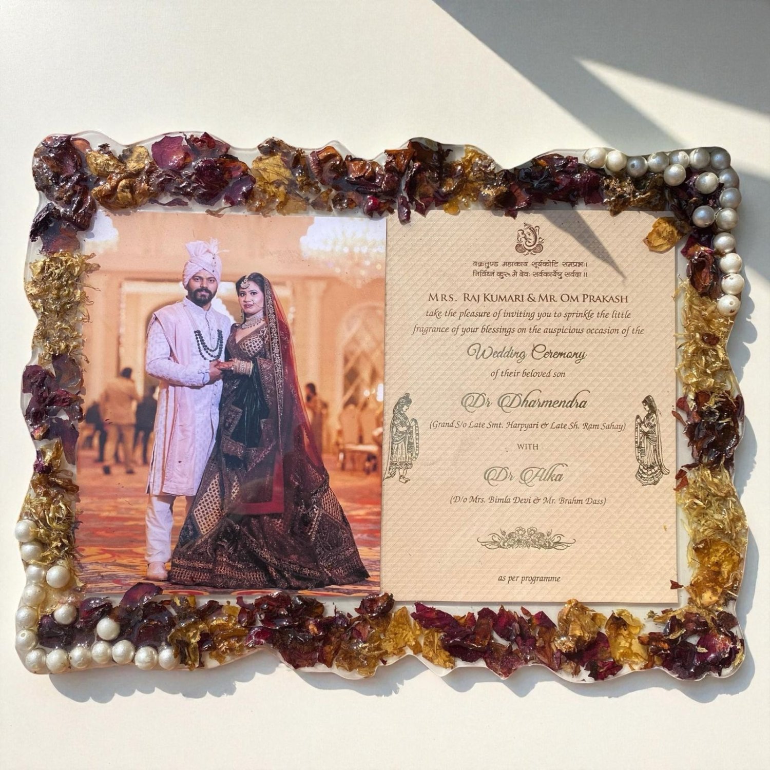 Capture the magic of your wedding day with this beautifully crafted Personalized Rectangular Zigzag Resin Art. This unique keepsake features your wedding photo at the center, surrounded by preserved varmala flowers that symbolize the love and joy of your special day. Custom-designed with your wedding photo and names, it’s a truly one-of-a-kind memento that reflects the essence of your wedding celebration.